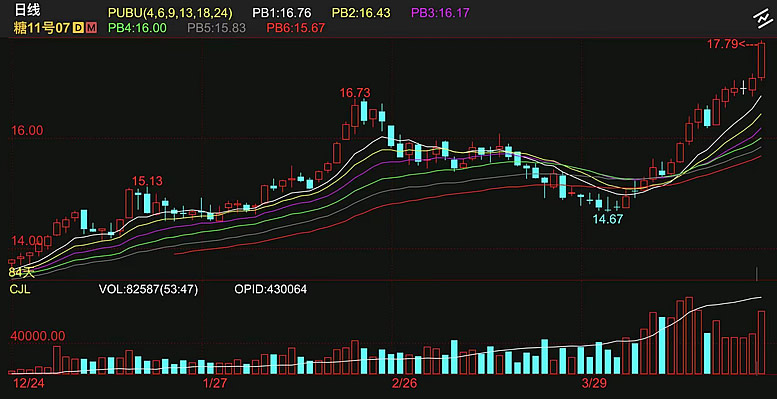 最终,现货5月原糖期货合约收盘上涨0.77美分,涨幅4.5%,结算价报收每磅17.94美分,该合约将于本周五到期交割;主力7月原糖期货合约收盘上涨0.66美分,涨幅3.86%,结算价报收每磅17.75美分,盘中触及17.79美分。