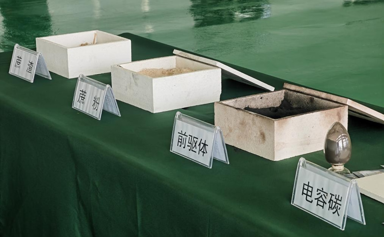 中南大学(崇左)新质生产力产业基地内展示的用蔗渣制成的电容碳各环节产品。新华社记者赵欢 摄