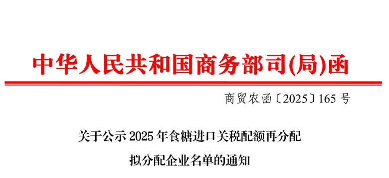 现将2025年食糖进口关税配额再分配拟分配企业名单进行公示。