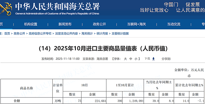 YNTW.COM 据海关总署11月18日公布的数据显示,2025年10月份我国进口糖 75万吨,较9月份增长20万吨,同比上年同期增长 39.0%;2025年1-10月我国累计进口糖 390万吨,同比上年同期增长 14.0%。