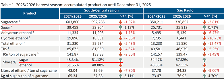 YNTW.COM 北京时间12月16日晚间,巴西蔗糖工业协会(Unica)发布了截至12月1日的最新生产数据。随着南半球雨季的临近和大部分糖厂收榨,巴西主产区(中南部地区,下同)2025/26榨季已正式进入收官阶段。
