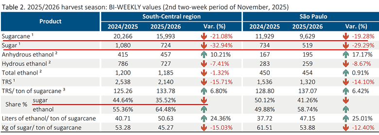 3. 圣保罗州仍是主要拖累: 作为核心产区,圣保罗州在11月下半月的食糖产量同比下降近30%,且累计甘蔗压榨量降幅(-3.81%)高于中南部平均水平。