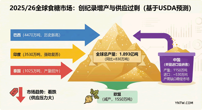 根据美国农业部(USDA)发布的最新一期《全球食糖市场与贸易》报告,2025/26榨季(2025年10月开启),全球食糖产量预计将飙升至 1.893亿吨的历史新高。