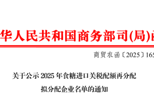 现将2025年食糖进口关税配额再分配拟分配企业名单进行公示。 公示期为2025年9月30日—10月6日。公示…