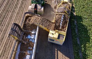 美国密歇根州农场自走式甜菜收割机正在作业 自走式甜菜收割机,集成除叶器和收割机 集成式自走甜菜收割机效率高